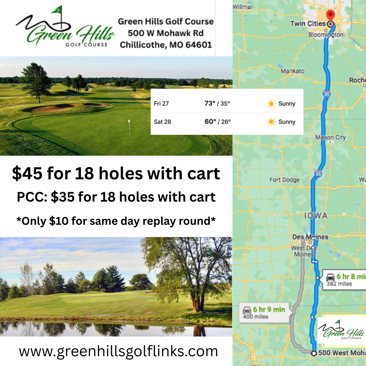 Green Hills GC* (Chilicothe, MO) - OPEN with $45 for 18 holes with cart and only $10 for same day replay rounds...book online at or call 660-646-6669
